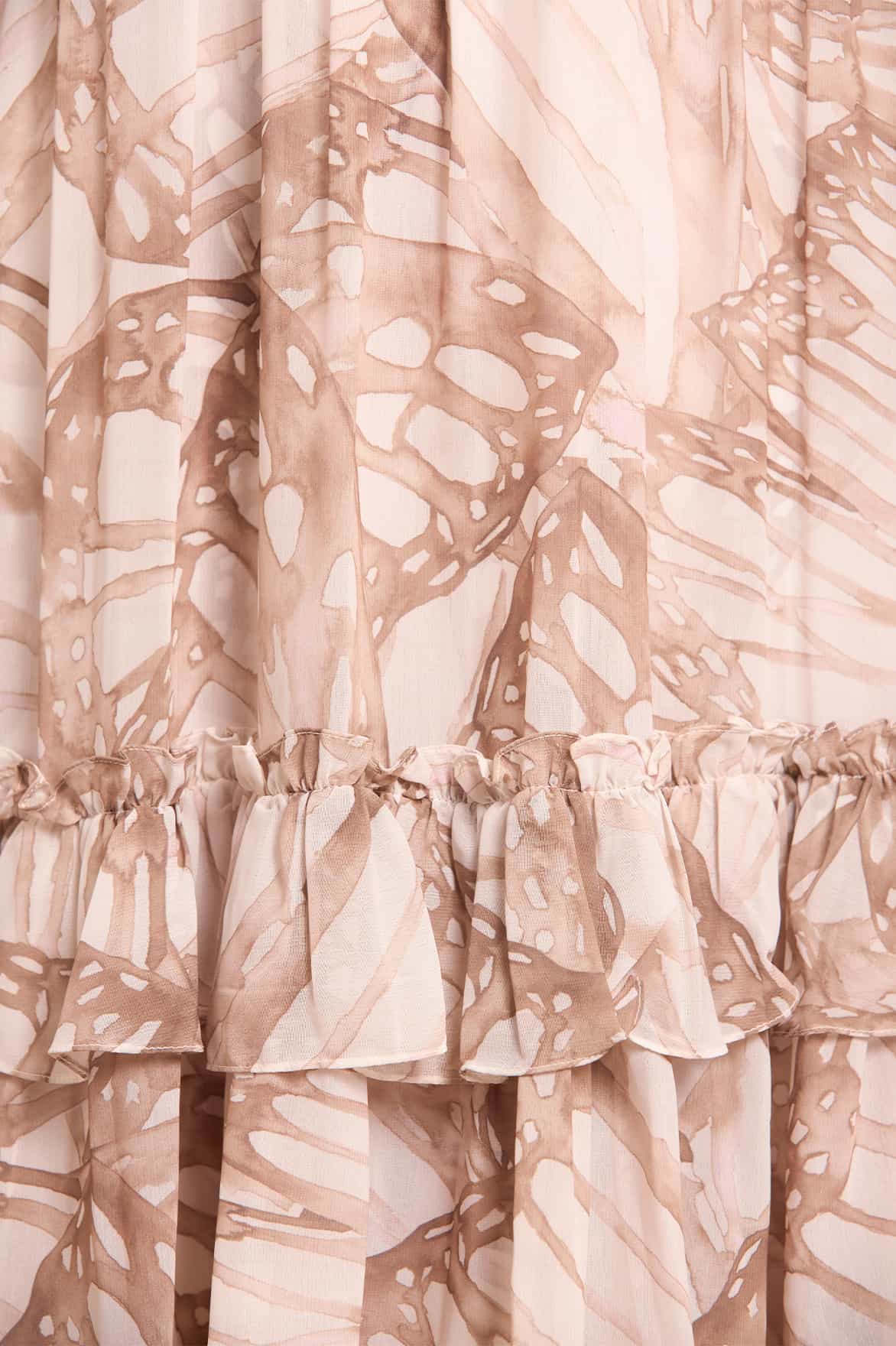 The Flutter Chiffon Long Sleeve Micro Mini Dress in Chestnut features a hand-painted watercolour butterfly print, with soft motifs that vary in scale. Made from semi-sheer chiffon, this flowing, easy-fit dress is fully lined for comfort. Crafted with signature Needle & Thread ruffles adorn the neckline, shoulders, and bust seam, while the gathered skirt hem with a top-stitched frill adds a whimsical touch. Developed with blouson sleeves, finished with delicate gathered frills and elasticated cuffs, complete the look. A timeless addition to your wardrobe.- Printed chiffon decorated with chiffon frills