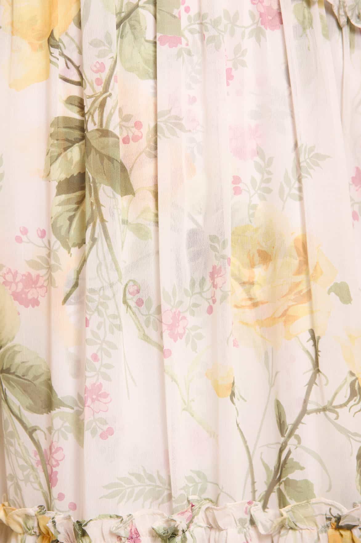 The Rose Chiffon Long Sleeve Micro Mini Dress in Moonshine/Yellow features a romantic print inspired by antique hand-painted artwork from the early 1900s, with large rose blooms and trailing florals. Made from soft semi-sheer chiffon, this easy-fit, fully lined dress is adorned with signature Needle & Thread ruffles at the neckline, shoulder, and bust seam. The gathered skirt hem is finished with a topstitched frill, while the blouson sleeves feature delicate gathered frills, ending in elasticated cuffs for a whimsical touch.