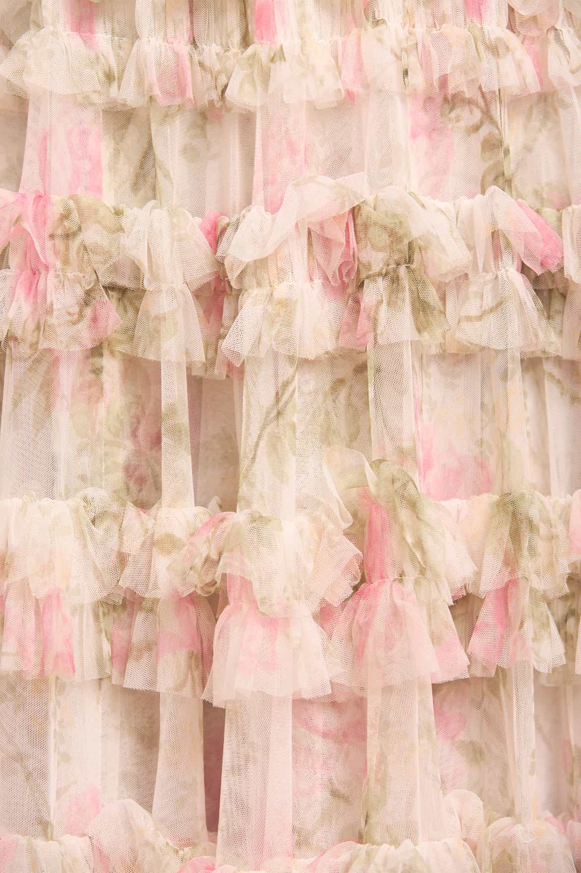 The Rose Lisette Off-Shoulder Gown in Moonshine/Pink features a romantic print inspired by antique hand-painted artwork with large rose blooms and trailing florals. This Hollywood-inspired gown has an elegant off-the-shoulder design, with double-stitched tulle frills graduating towards the hem. The voluminous skirt, made of layers of net and tulle, finishes with a sweeping hemline, creating a beautiful silhouette. Perfect for any special occasion.- Floral printed tulle decorated with layers of tulle ruffles.